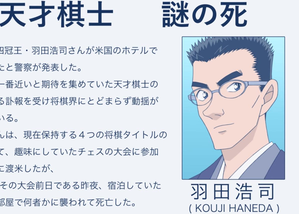 17年前,将棋四冠王羽田浩司出于兴趣,远赴美国参加国际象棋比赛,并入住了一家名为JUCK的酒店。在比赛前夜,羽田浩司遇刺身亡。他暂住的房间凌乱不堪,厕所的水龙头一直开着,遗体手中曾握过剪刀一类的物品,没有被殴打的痕迹,但死亡原因不明。