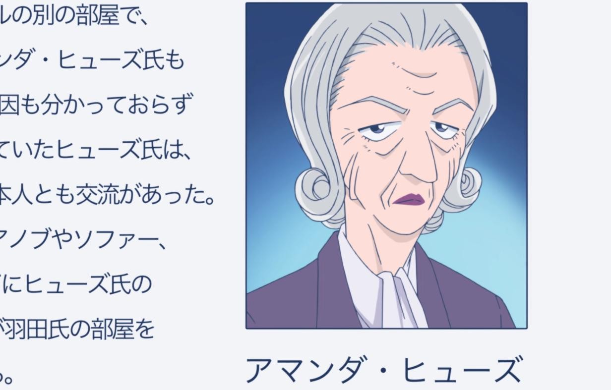 警方调查发现,阿曼达跟FBI和CIA关系紧密,同时也是羽田浩司的粉丝。案发当天阿曼达曾去过羽田浩司房间,两人还点了英式下午茶。现场留有打碎的写有“P T O N”的镜子。