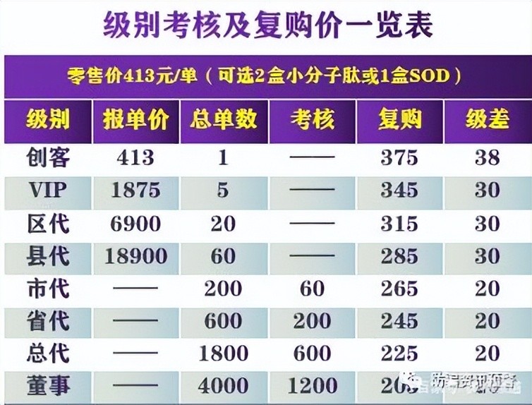 公司采用新零售模式,奖金秒结秒领。小分子肽:2盒/413元/单,SOD:1盒/413元/单)。运营费14元/单,净营业额:399元/单。级别考核一览表如下图:
