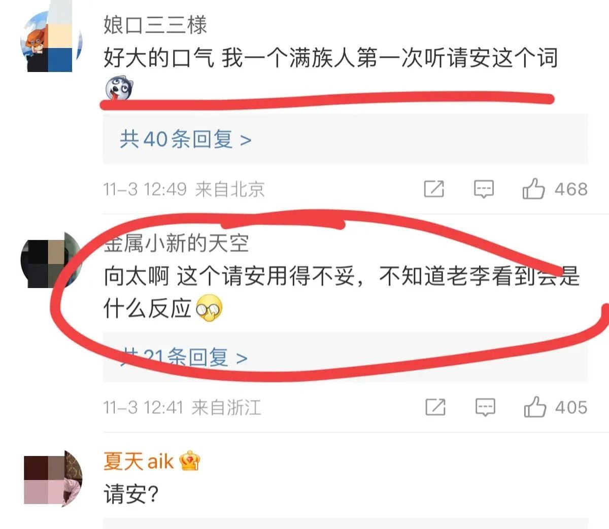 网友们却发现向太在文章中使用了“请安”这个词语。明明是朋友之间的问候语句,为什么会变味呢?网友纷纷表示: