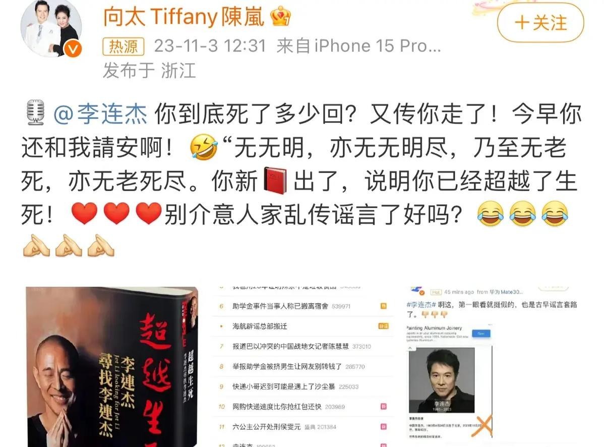关于李连杰去世的消息在网络上迅速传播开来,引起了无数网友的惊恐。然而,在大家都在等待李连杰本人辟谣时,向太却发表了一篇愤怒的文章,其中连续三次质问着李连杰:“李连杰,你到底死了多少回?又传你走了!今早你还和我请安啊!”