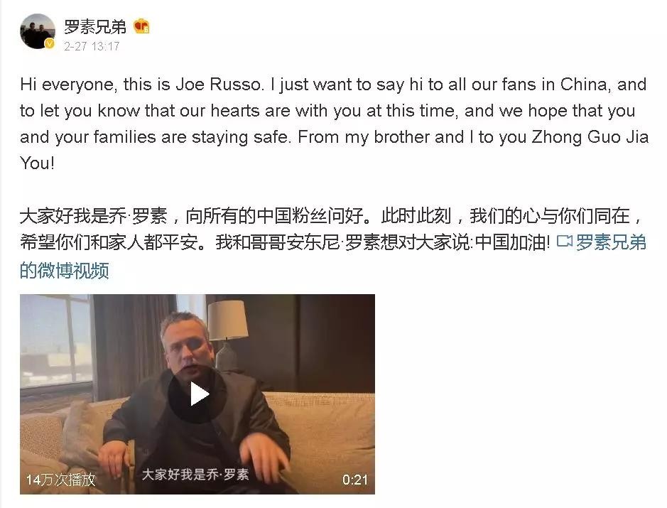 在这次疫情中,罗素兄弟也是少数为中国发声,为中国加油的好莱坞明星。