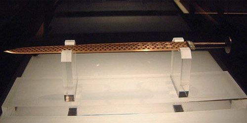 越王勾践剑,属青铜剑,制作精美。剑首外翻卷成圆箍形,内铸有间隔只有0.2毫米的11道同心圆,剑身上布满了规则的黑色菱形暗格花纹,剑格正面镶有蓝色玻璃,背面镶有绿松石。剑身修长,有中脊,两从刃锋利,前锋曲弧内凹。茎上两道凸箍,圆首饰同心圆纹。
