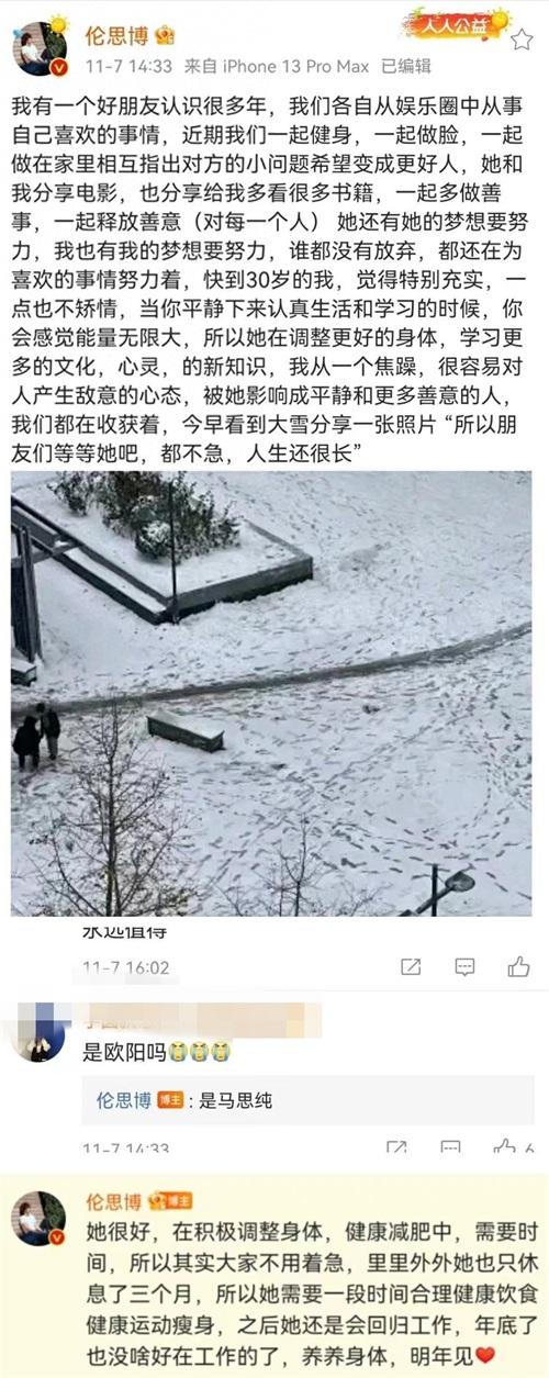 对于马思纯的粉丝来说,这次伦思博的回应无疑是一个大大的安心,他们表示会继续关注马思纯的身体状况,并期待她在明年复出。毕竟,人生还很漫长,马思纯一定会以更好的状态回归工作的。