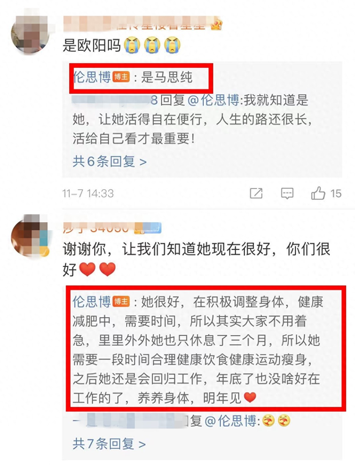 伦思博在微博中替马思纯报平安,并表示她正在努力调理自己的身体,学习更多的文化知识。这也表明了马思纯已经逐渐摆脱抑郁症的困扰,开始积极平静地生活和学习。伦思博的微博回应也得到了马思纯粉丝们的一致认可,大家表示会给她更多的时间来恢复身体,并期待她的工作复出。