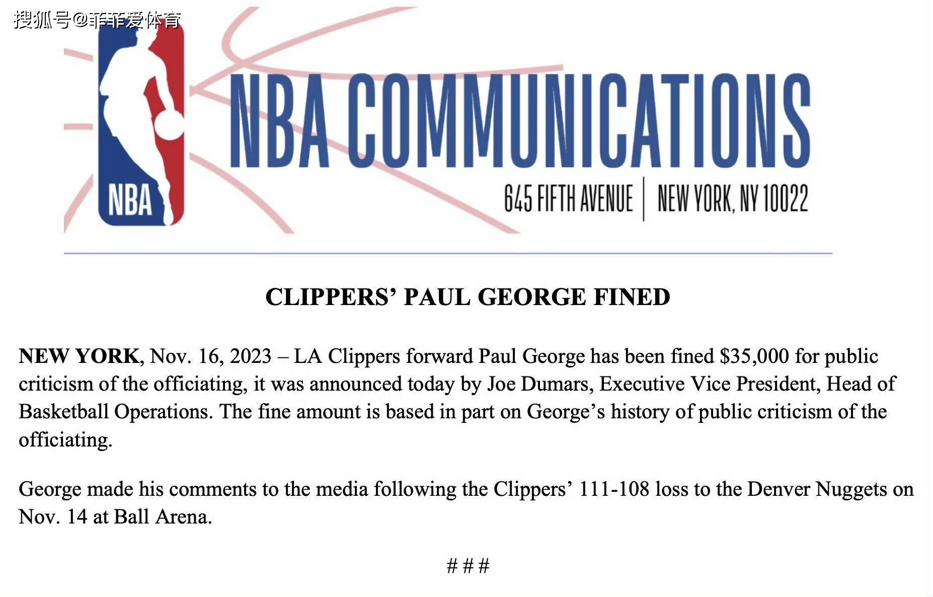 NBA官方在公告明确表示,对于乔治的3.5万美元罚款是有充分事实依据的。