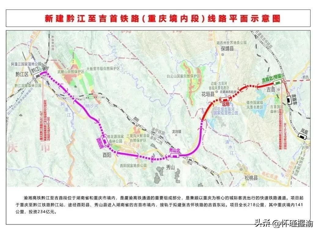 2018年11月22日,渝黔高铁正式开工,预计2025年6月开通运营。届时,重庆站至黔江站,全长约265公里,最高时速350公里(运营初期300公里)。