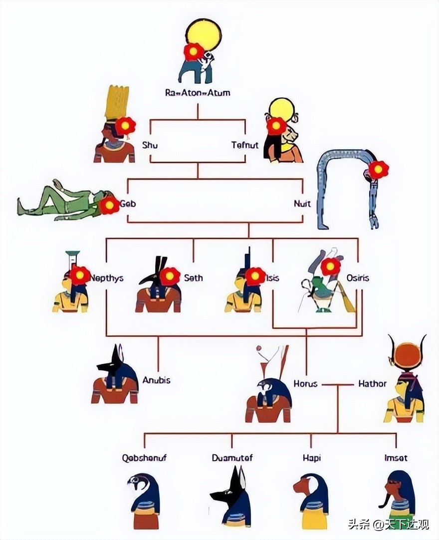 (二)在古王国时期就已经发展出来,以赫里奥波里斯城(heliopolis)为中心的系统认为,在世界未创造之前,有一大神阿图姆(atum),阿图姆自我受精而生出了空气(舒)和水气(泰芙努特);空气和水气结合,生了天(努特,nut)和地(盖布,geb);天地结合又生了奥西里斯、伊西斯、赛特、奈芙蒂斯四名子女,这四者即为世间一切的创造者。