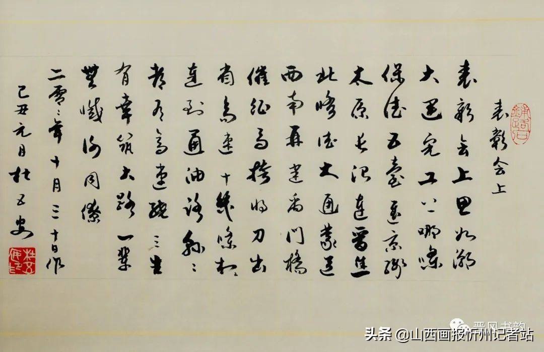 像杜五安省长,他的诗写得非常好的,但是他的书法,既有传统的渗透,同时又有时代的风貌,作为一个书家,实际上这是始终追求的,在孙过庭书谱里有一句话,叫做“古不乖时,今不同弊”。他的意思就是,学古的时候,不要忘了时代的东西;那么学时代的东西,不要学一些弊端,应该学一些优秀的东西,所以我觉得杜省长他实际上在学书法这个路子上是正确的。
