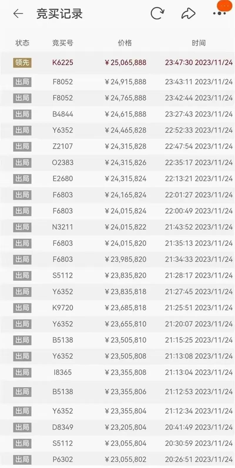 此次拍卖吸引了近4万人围观,720人报名竞价。这位姓李的自然人在这场激烈的竞拍中脱颖而出,成功购得这个罕见靓号。拍卖过程中,价格在短短半小时内就达到了70万元,之后又大幅飙升,最终突破了2000万元大关,令人咋舌。