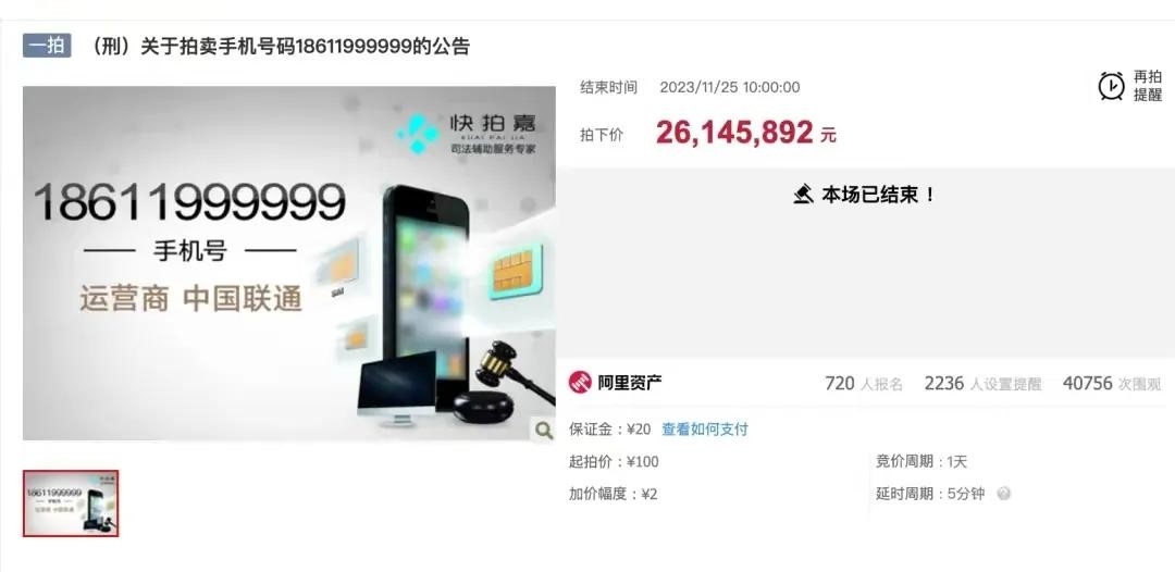 近日,一起刑事案件案犯的手机号码在国内拍卖市场上引发了巨大关注。这个拥有六个9尾号的手机号码,起拍价为100元,却在短短半小时内价格飙升,最终以2614万元的天价成交,创下了国内手机号拍卖的新高纪录。