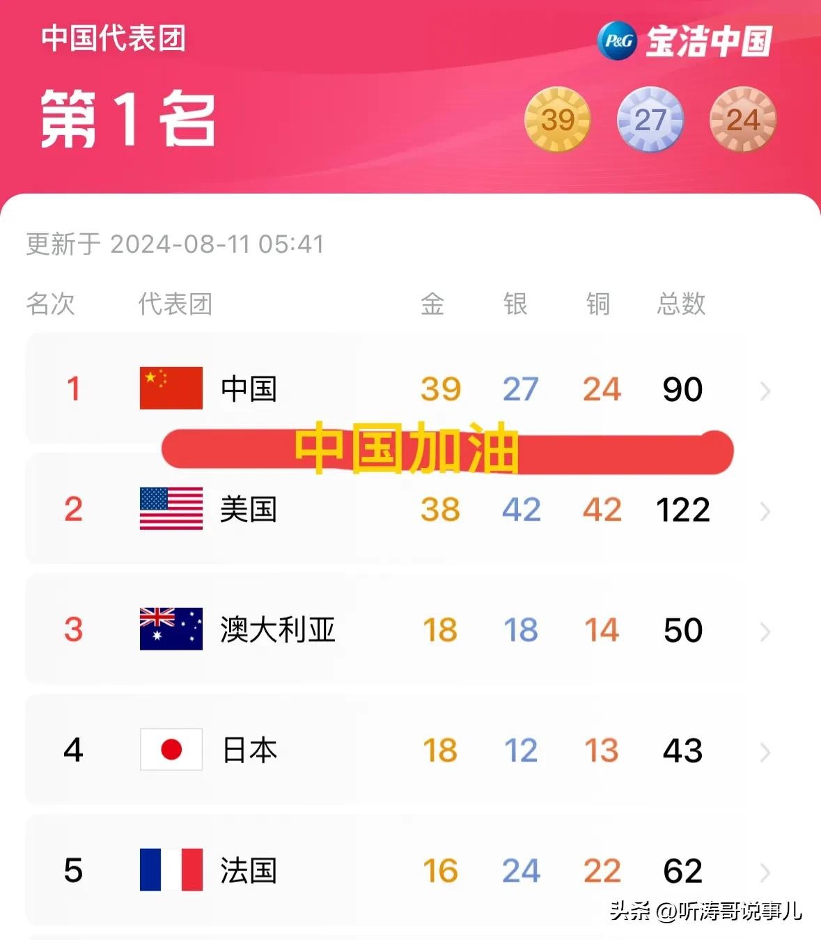 奥运会金牌榜最新排名,中国队以39枚金牌的成绩重回金牌榜首位。