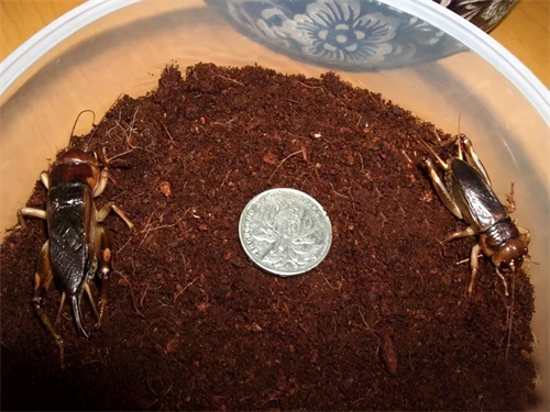 “花生大蟋”野外喜欢穴居深土洞中,昼伏夜出。养在盆里、叫罐等一些器具里面很少会叫,也不能很好地体现出它穴深而居的特性,排泄物也很多,尤其喂以黄瓜后排物会有湿状,而且用具要经常清理。开始我养在有椰土的塑料圆盆里觉得深度不够,后来换到了大号的长方形龟盒里使其活动空间尽可能大点,外表透明也便于能平时观察。将其放在有十公分高的椰土上它就会挖洞钻于最底部藏居,再深点看来还会往下钻。旁边也置有一些树皮搭的掩体,让其爬寻,隐藏栖息,有时也将食物放于树皮上面,夜晚它会出洞寻觅。夏季饲养水一定要备有,蟋蟀用的一般大小的一水盂水有时一天不到就没了。喜欢独居,都各自挖洞穴而居,夜晚雄虫在洞穴口处或树皮处以鸣叫声呼诱雌虫过来进行交尾,只有交配时才雌雄同居。