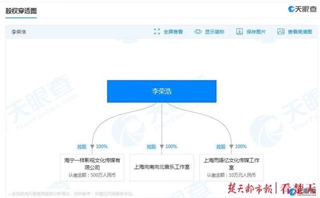 天眼查数据显示,李荣浩目前拥有三家公司,分别是海宁一样影视文化传媒有限公司、上海向南向北音乐工作室、上海而唔忆文化传媒工作室。三家公司的法定代表人均为李荣浩,并且100%控股。