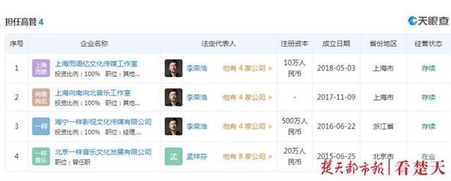 除上面三家公司之外,李荣浩还曾担任其个人工作室运营主体:北京一样音乐文化发展有限公司的高管。