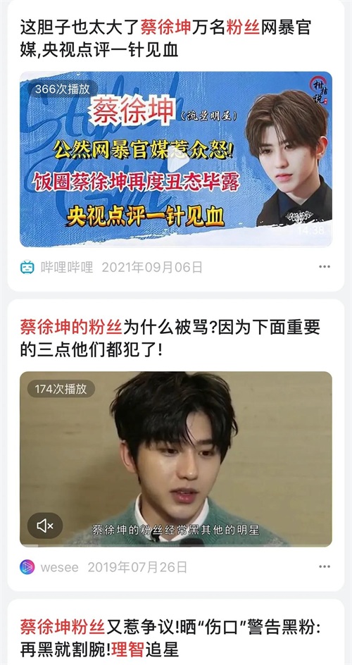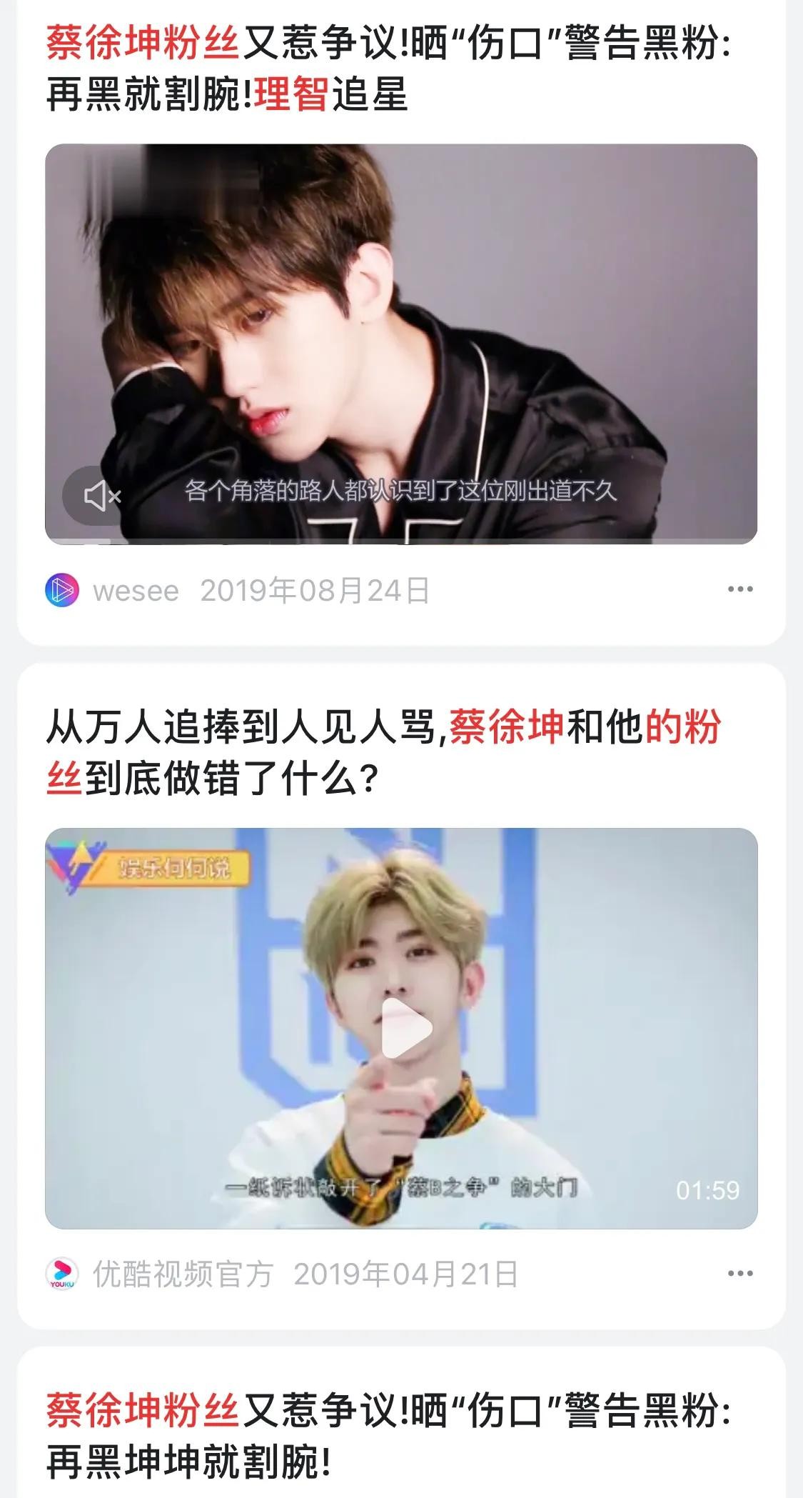 第二点我个人觉得应该与蔡徐坤的粉丝有关,没错就是ikun,由于蔡徐坤的粉丝大部分都是女性,并且太过疯狂,竟然做出万人网暴官媒的事,更有甚者,竟然为了维护自己的爱豆,晒伤口警告黑粉不要再黑蔡徐坤,否则就割腕。也许正是因为蔡徐坤粉丝的不理智行为,上升到爱豆本人,导致广大网友更加讨厌蔡徐坤,这也是其中很重要的一个因素。