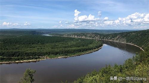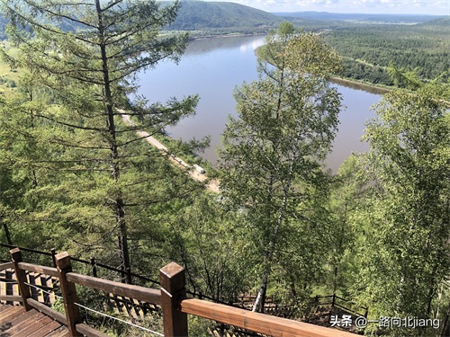 龙江第一湾是黑龙江上游一个壮观的江湾景观。黑龙江流经大兴安岭图强林业局漠河施业区红旗岭段时,回流急转,形成了三个独特的“Ω”字形的江湾景观,围绕出三个与内陆相连的岛屿:中间由南向北突出的半岛属于中国,名为北极岛;河对岸左右两座由北向南伸过来的半岛属于俄罗斯,分别为金环岛和银环岛(估计这是咱们这边景区自己给人家取的名字)。