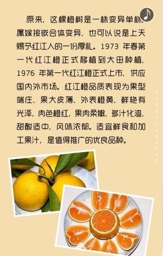 红江橙,产于“中国红江橙之乡”广东省湛江红江农场(位于广东省廉江市境内),1971年,生产技术人员在红江农场19队橙园中选出的一个变异单株,属嫁接嵌合体变异。果大形好、皮薄光滑、果肉橙红、肉质柔嫩、多汁化渣、甜酸适中、风味独特,在国内被誉为“人间仙桃”,在国外则被冠为“中国橙王”,是我国柑橙的名优新品种。红江橙起源及其简介;