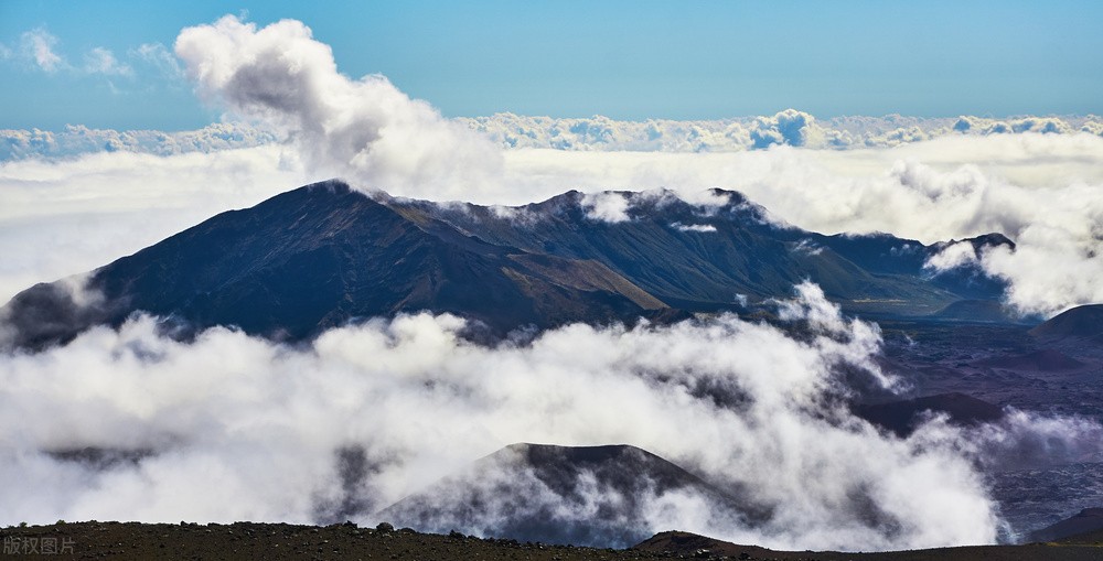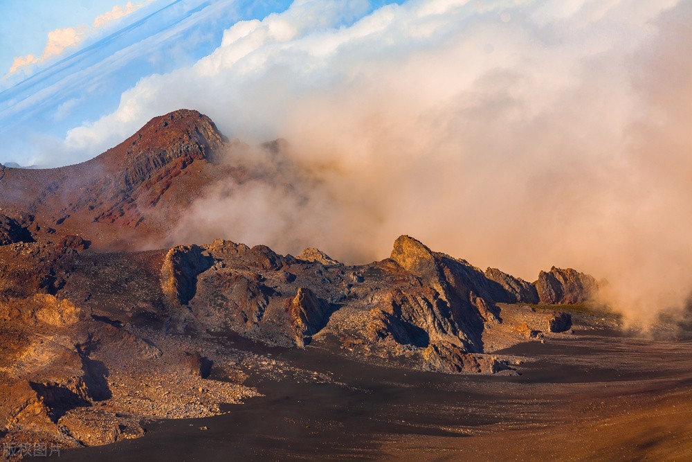 哈莱阿卡拉火山是世界上最大的休眠火山,火山口周长33.8千米,深900多米,围绕火山锥的路径全长48.3千米。如同月球表面的地表特征,海拔3030米的高山,形成了特有的自然景观。“哈莱阿卡拉”夏威夷语是“太阳之家”的意思。这儿的景观以红褐色为主色调。平常每天清晨八九点钟的时候,山下的浓雾就会升起,四处的景观全隐蔽在浓浓的雾气之中,惟有火山顶峰周围可以看得见晴天丽日。哈莱阿卡拉火山国家公园建于1961年。在空旷辽远,大气磅礴的哈莱阿卡拉火山国家公园内,散见于荒芜冷漠的地面上的绿色植物——银剑,是一种濒危植物。这种植物生长寿命可达20多年,其生命旅程结束的时候,会在自己不满1米高的躯体上开出成百上千朵花来,以灿烂的艳丽完成生命的最后一瞬间,给哈莱阿卡拉留下芬芳。