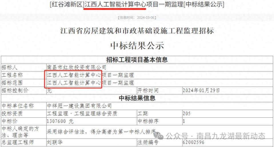 2024年,九龙湖又有一大批省市级配套要建设,九龙湖人的信心更足了、干劲更足了!近期,位于九龙湖龙虎山大道以西,科创大街以北区域的江西人工智能计算中心项目一期监理[中标结果公示],招标人为南昌市红欣投资有限公司,中标单位名称为中祥冠一建设集团有限公司,采用综合评估法,得分高者为第一中标人排序。