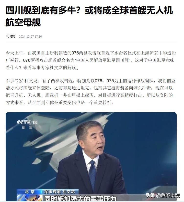 光明网2024-12-27《四川舰到底有多牛?或将成全球首艘无人机航空母舰》
