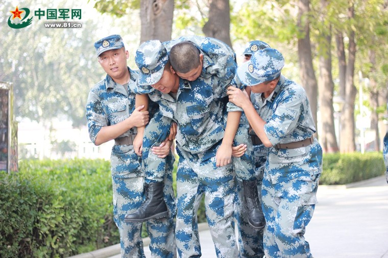 新兵因中暑晕倒在训练场,班长满心焦急地送他去卫生队。