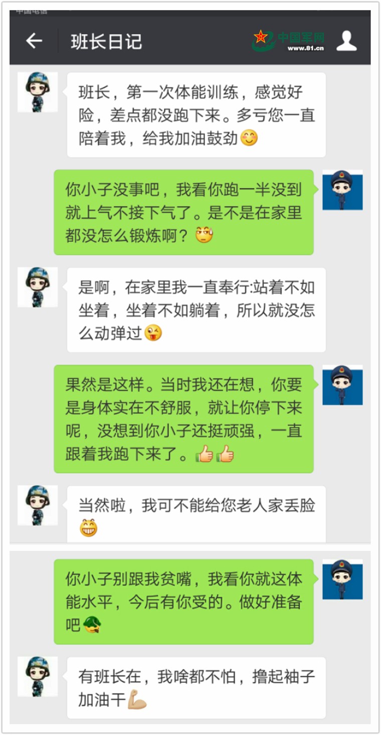 暖心!今天,新兵体能训练差点没有跑下来,还好有班长一路的陪伴,新兵坚持跑完了全程。这是体能训练结束后新兵与班长的聊天记录,我们为班长点赞,他既能及时加油鼓劲新兵,又能做好以后训练的思想工作。