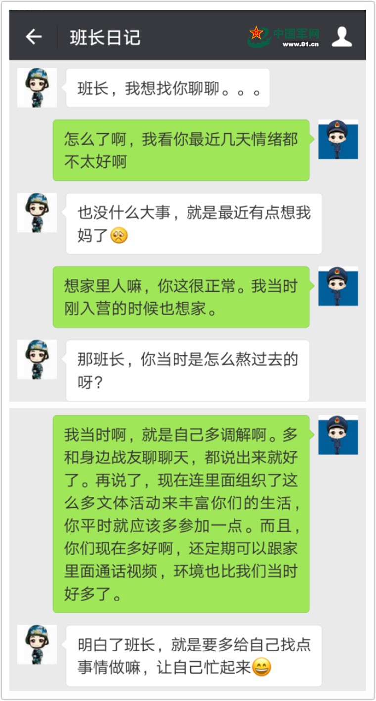 今天,新兵想家了,他第一个想到的是找班长聊聊天,班长用自己的亲身经历为新兵进行了心理疏导,积极引导新兵融入集体生活。真是一名好班长,班长的用心良苦,我们都感受到了。