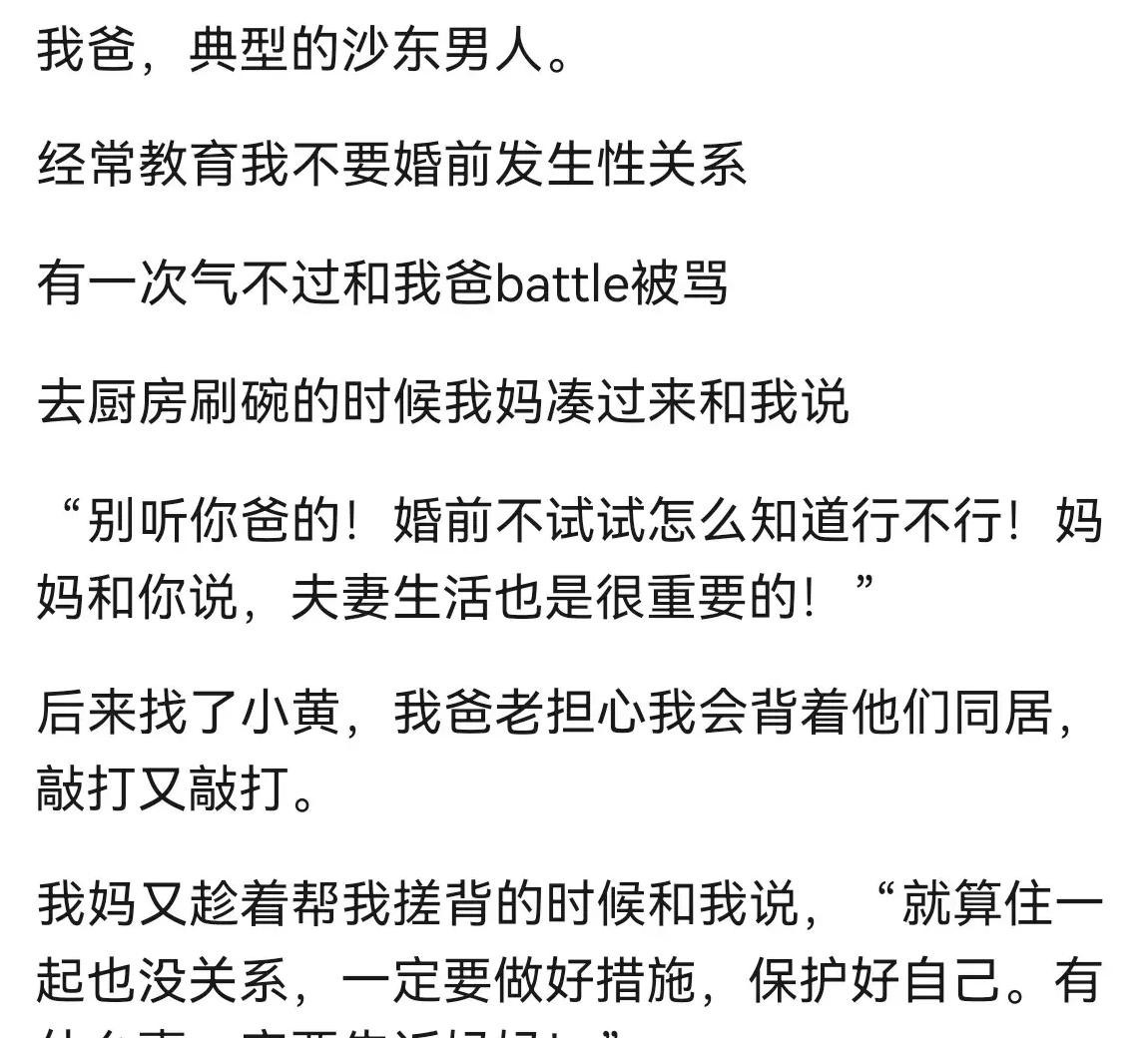 父母之间也可能对待性话题存在差异。一位网友分享了她和父母谈论性话题的经历:“妈,小孩是哪里来的?”“土里刨出来的。”这句幽默的回答展示了父母对待这个话题的隐晦态度。