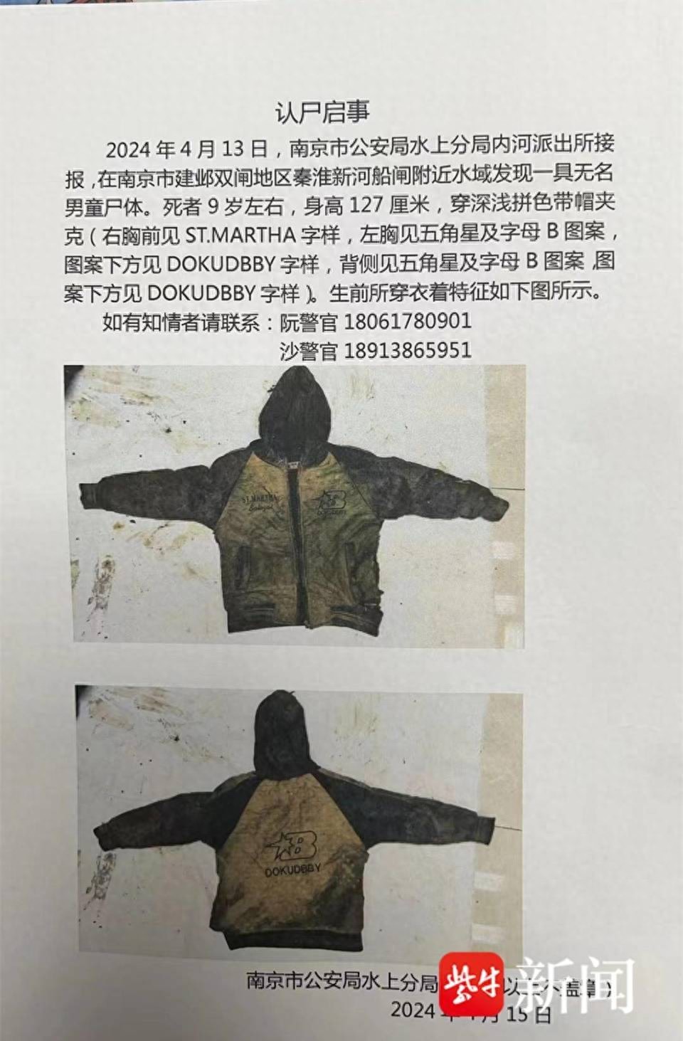 扬子晚报紫牛新闻从该认尸启事被打印于纸张上,附有孩子穿着上衣的明显特征,其内容显示:2004年 4月13日,南京市公安局水上分局内河派出所接报,在南京市建邺双闸地区秦淮新河船闸附近水域发现一具无名男童遗体。死者9岁左右,身高127厘米,穿深浅拼色带帽夹克落款署名为南京市公安局水上分局,日期为4月15日。该肇事上附有男童生前所穿衣着的照片,警方特别提到衣服上的明显的特别标志。