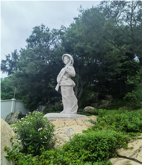 经过海湾大桥,也就码头边的海面上,有一块黑褐色的浮石,据说是当年妈祖普渡渔人化神入海时留下的,叫“妈印石”。岸边还有一个名为“海霞”的雕塑,是以为海岛女民兵的形象,是因为当年红色电影《海霞》而创作。