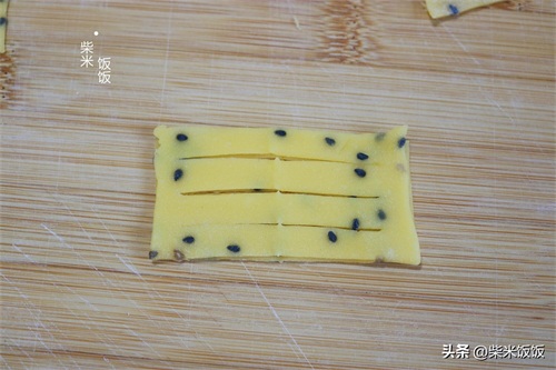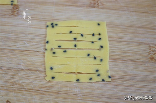 6,取一个面皮对折,从对折的这边切7刀,另一边不要切断了。