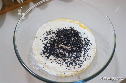 2,倒入360克面粉、10克芝麻,搅拌至没有干面粉,再倒入20克食用油。
