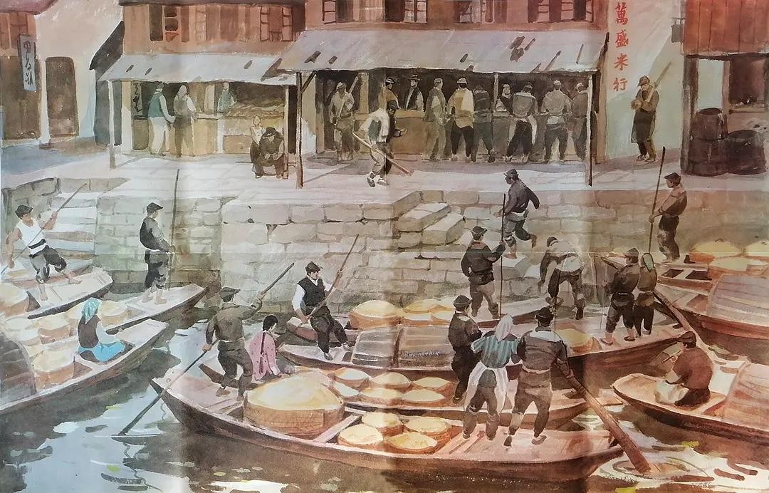 万盛米行的河埠头,横七竖八停泊着乡村里出来的敞口船。船里装载的是新米,把船身压得很低。齐船舷的菜叶和垃圾给白腻的泡沫包围着,一漾一漾地,填没了这船和那船之间的空隙。河埠上去是仅容两三个人并排走的街道。万盛米行就在街道的那一边。朝晨的太阳光从破了的明瓦天棚斜射下来,光柱子落在柜台外面晃动者的几顶旧毡帽上。