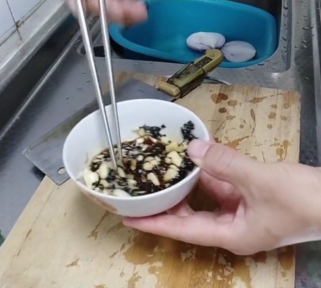 2、配置调料:将大蒜瓣切成碎末放入碗中,放入黑芝麻5克,倒入生抽5克,倒入白醋5克,加入白糖5克,加入精盐3克;