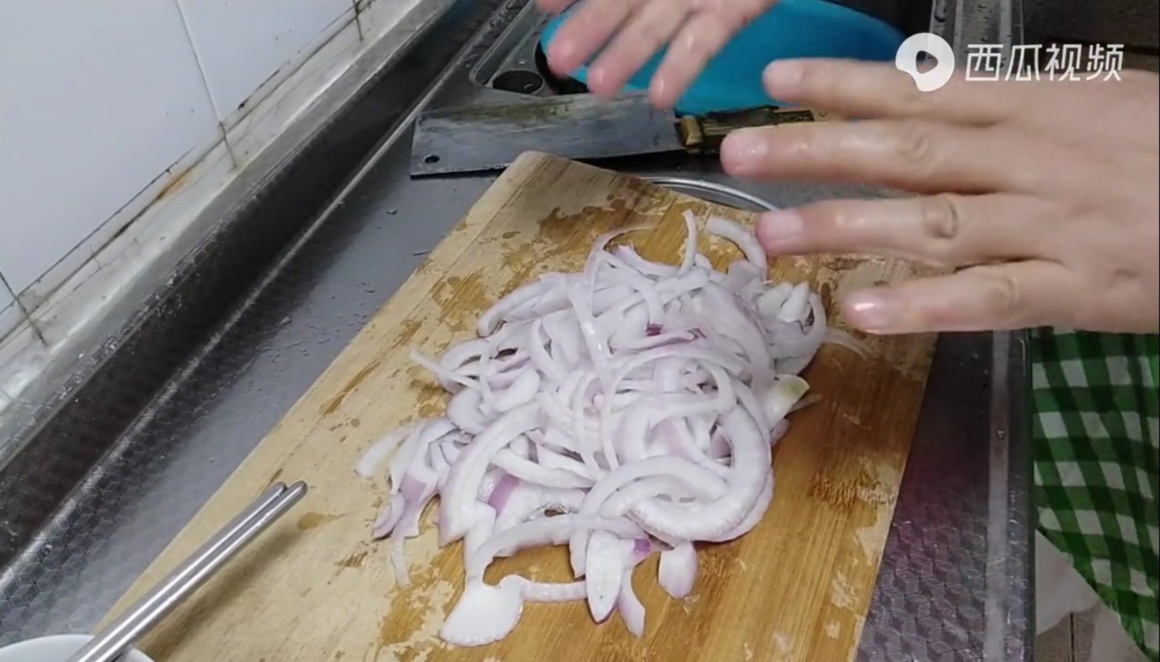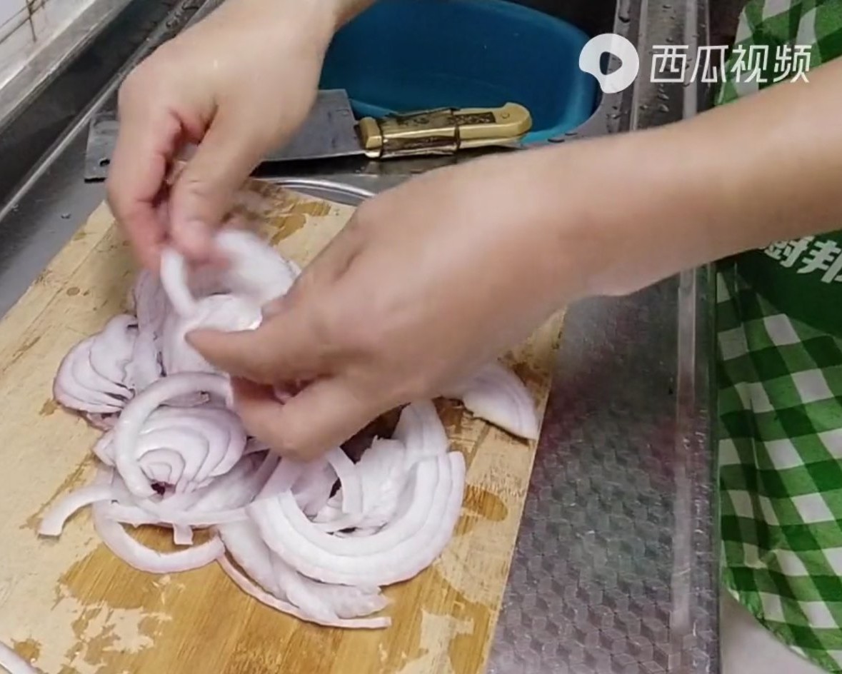 3、从清水中捞出洋葱,切成细丝,并用手将粘在一起的撕开。
