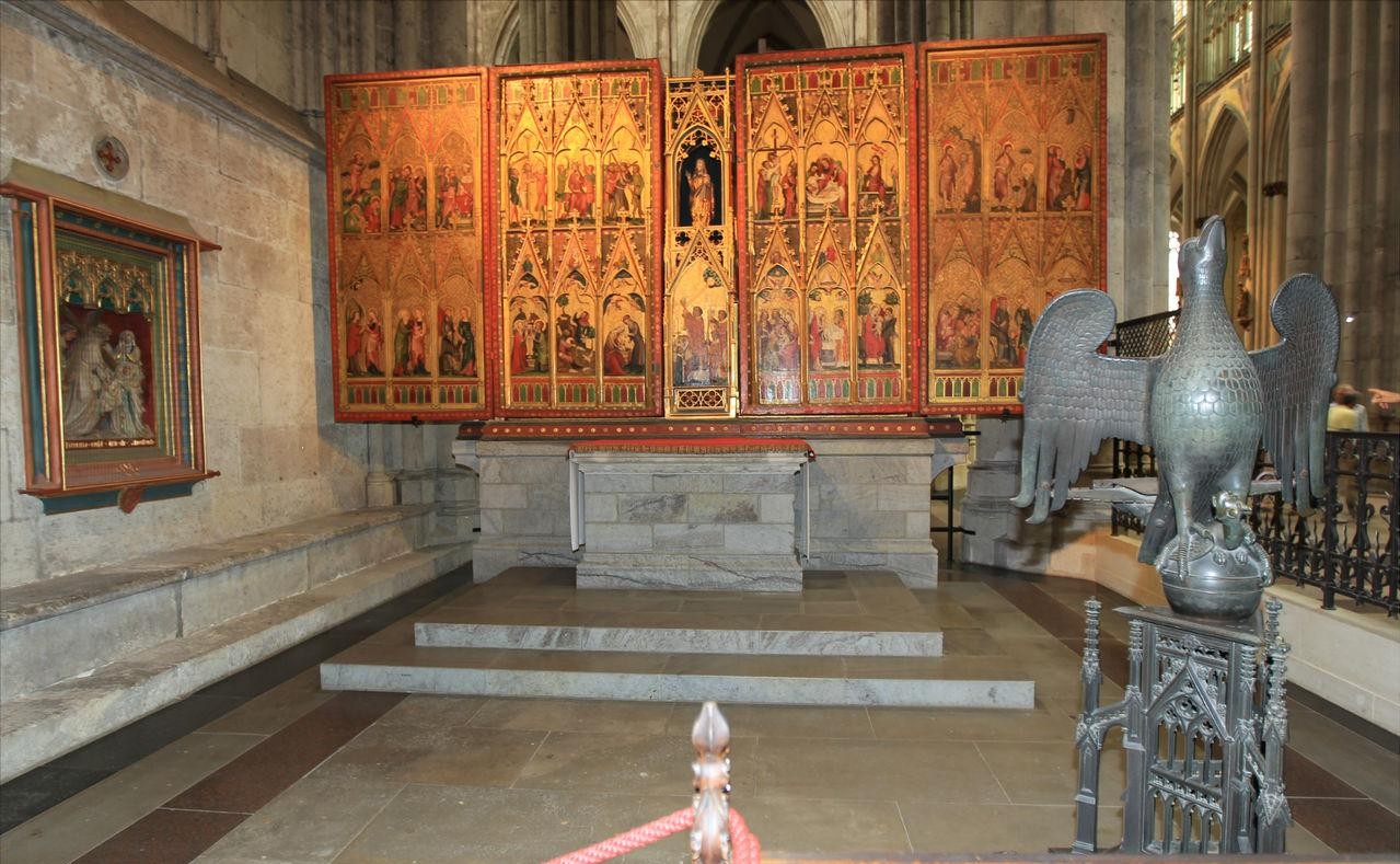 圣骨,即“三王圣骸”,所谓“三王”就是《圣经》记载中基督圣婴出世时不远万里赶去朝拜并送去礼物的三位东方国王,又说是三位贤人或者魔法师将其从米兰夺取,并赠送给科隆的一座教堂。这之后教堂就成为一个重要的朝圣地,老教堂显得不堪其用,于是人们于1248年将其拆除,在原址上建起了著名的科隆大教堂。科隆大教堂内安放了西方世界最大最奢华的圣体匣用存放“三王圣骸”。