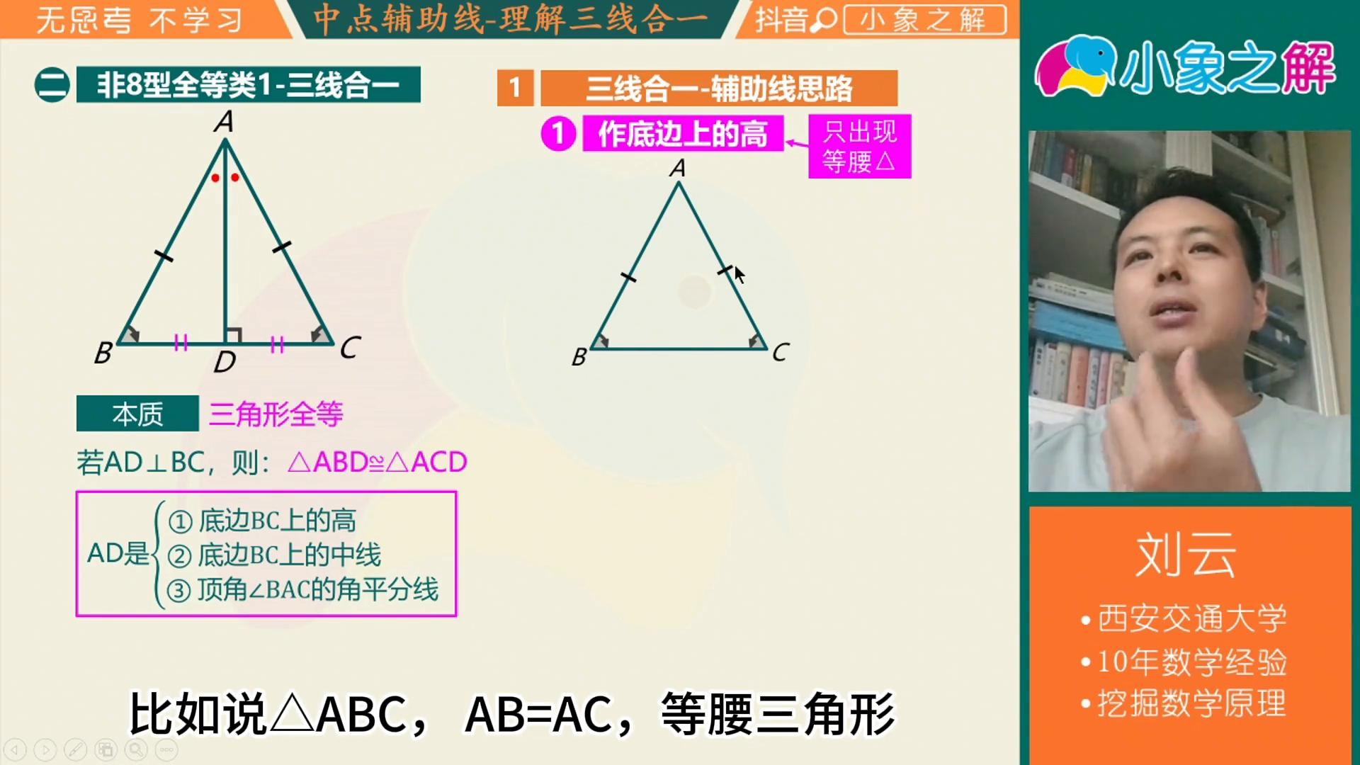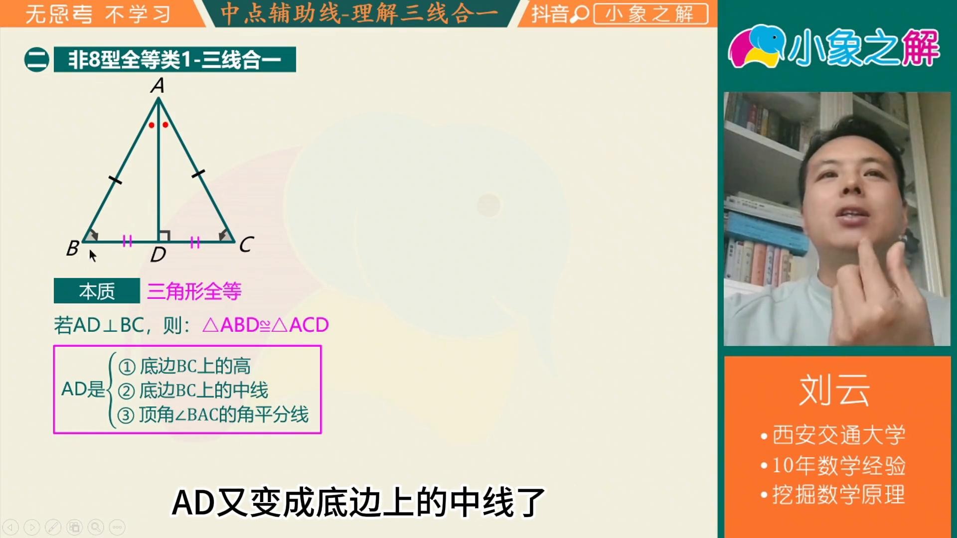 下面一个视频,我们来讲解等腰三角形中,构造三线合一的实际运用。学会思考,关注“小象之解”,我们下集见!