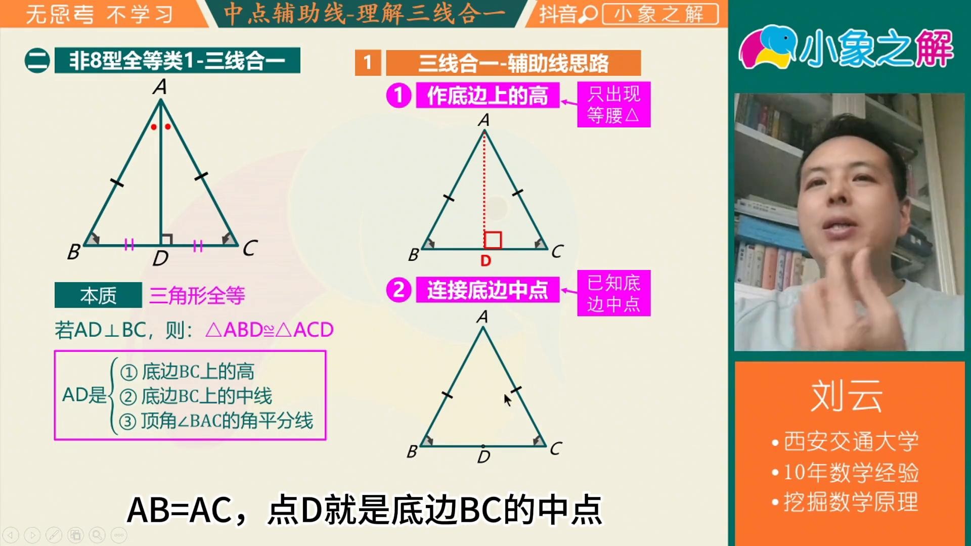 3. 现在考察 AD 这条线段,它首先是底边上的高,因两个三角形全等,AD 又变成底边上的中线,同时还是顶角 BAC 的角平分线,这就是三线合一的本质。