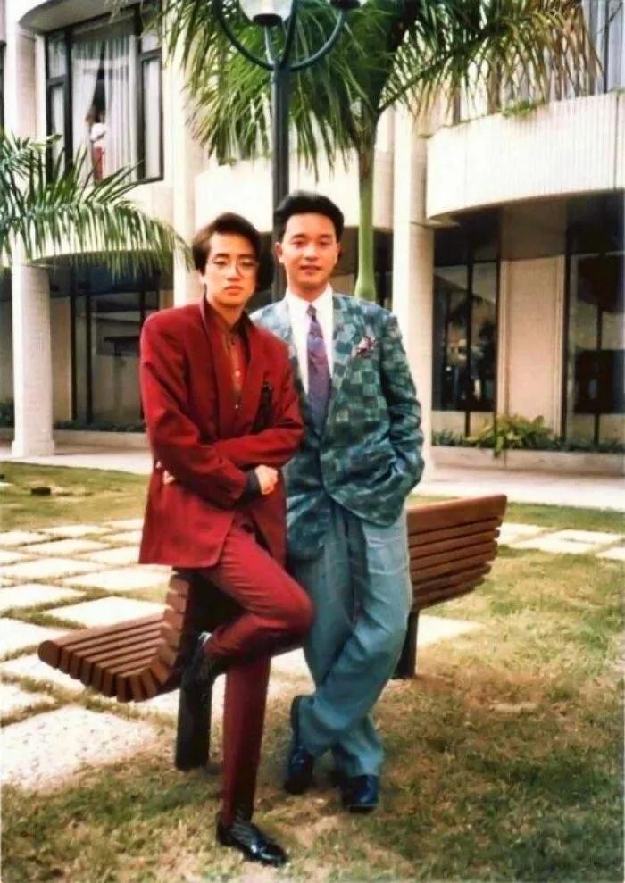 早期的张国荣和梅艳芳,还是显得很青涩,不过着装已经很潮流时尚了。