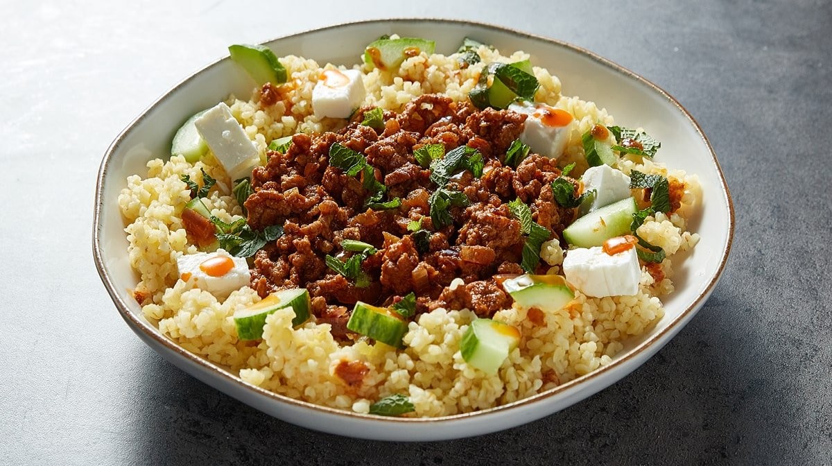 1 汤匙油1 颗红洋葱(切片)1 汤匙摩洛哥香料粉(摩洛哥香料混合物,包括肉桂,小茴香,香菜,所有香料,胡椒和生姜)3 汤匙番茄酱250克羊肉末盐和胡椒调味125毫升开水130克干小麦100克羊乳酪(立方体)½ 根黄瓜(切块)新鲜薄荷叶装饰