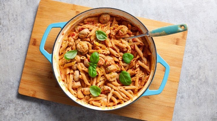 1 茶匙100%椰子油1 根 韭菜(切细片)2 瓣大蒜(切碎)8 根减脂香肠(切片)200 克 夸克干酪1 罐 切碎的西红柿240 克 全麦通心粉1 茶匙 干辣椒片1 撮 盐和胡椒粉 调味1 把 新鲜罗勒叶