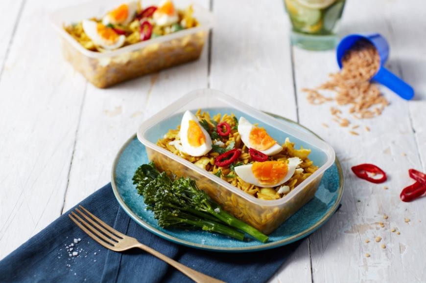 4.加入煮熟的米饭和黑线鳕鱼,搅拌。加热,然后加入煮鸡蛋并再次搅拌。转移到备餐容器中并与您选择的蔬菜一起食用。
