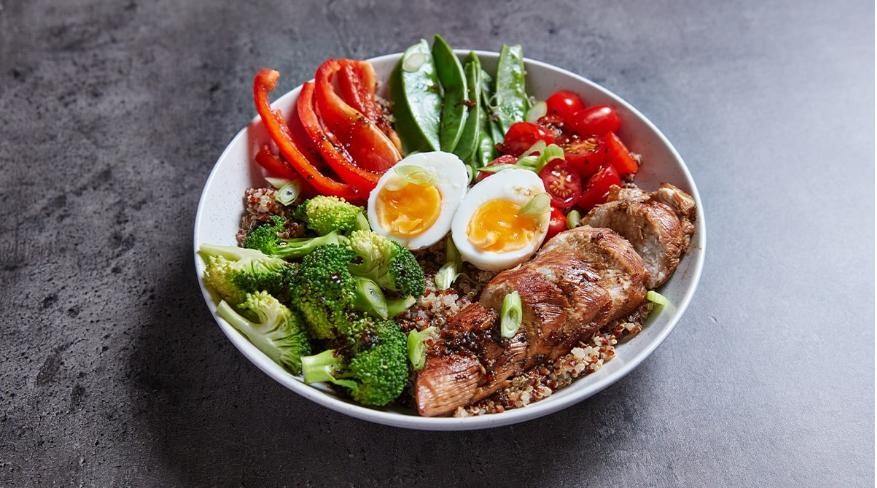 首先,将酱油、蜂蜜、黑胡椒和大蒜混合在一起制成腌料。将 3/4 的腌料倒在鸡胸肉上,盖上盖子,然后在冰箱中腌制 30 分钟(或者您可以在前一天晚上腌制)。把剩下的腌料放在一边备用。接下来,将藜麦和 200 毫升水放入锅中,盖上盖子,煮沸。煮沸后,在锅上加一个筛子,然后将鸡蛋放在藜麦上方的中心。再次盖上锅盖,大火蒸10分钟。与此同时,在另一个煎锅中,加热少许油或低热量烹饪喷雾,然后加入腌制的鸡胸肉。每面煮约 5-7 分钟,直至变成棕色并完全煮熟,里面没有粉红色的碎片。将西兰花和芒果放入藜麦上方的筛子中,然后盖上锅盖,再蒸 5 分钟。然后小心地取下筛子,用叉子搅拌藜麦,使其蓬松。打造你的蛋白质碗。制作藜麦底料,然后加入煮熟的西兰花和芒果,以及红辣椒片和樱桃番茄。加入切好的鸡胸肉和煮鸡蛋(先去壳!),然后加入剩下的腌料,用切碎的葱装饰。