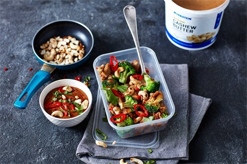 3 汤匙腰果酱2 汤匙酱油2 汤匙枫糖浆或龙舌兰糖浆2 瓣大蒜1 茶匙五香粉4块鸡胸肉(切丁)1 朵西兰花(切小朵)40克腰果2 条红辣椒(切丁)一把新鲜香菜300克印度香米(煮熟)