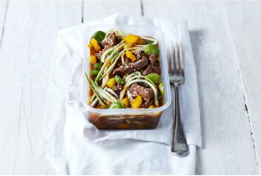1 茶匙椰子油3块臀肉牛排(切片)4 个西葫芦(螺旋状)2个黄辣椒(切碎)75克 毛豆撒上芝麻