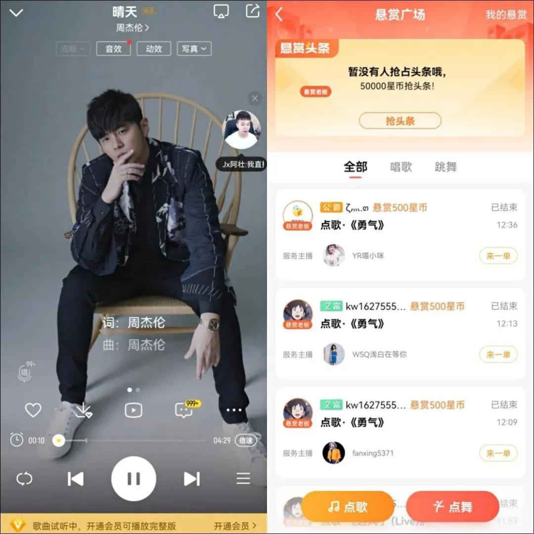 而更具趣味性的是,用户还可以通过“点歌现场”、采用“用户下单-主播接单”的形式,悬赏选择想听的歌。