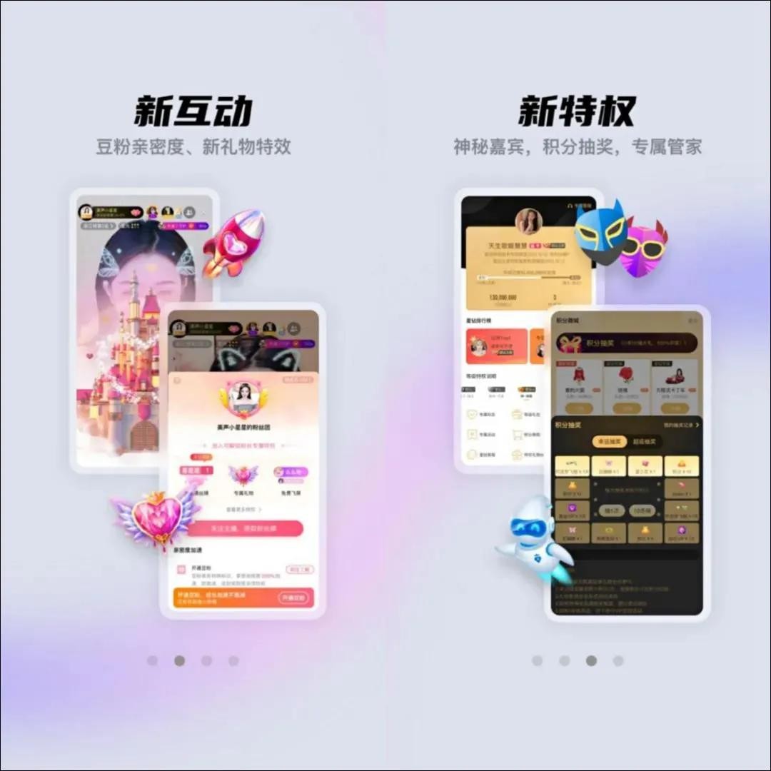 第四变,在用户特权和礼物特效方面,新版本不仅添加了专属礼物、神秘嘉宾、全站升级公告三个新特权,还添加了豆粉亲密度、新礼物特效两个互动效果,相比视觉的设计上更为酷炫,大大提升送礼排面。