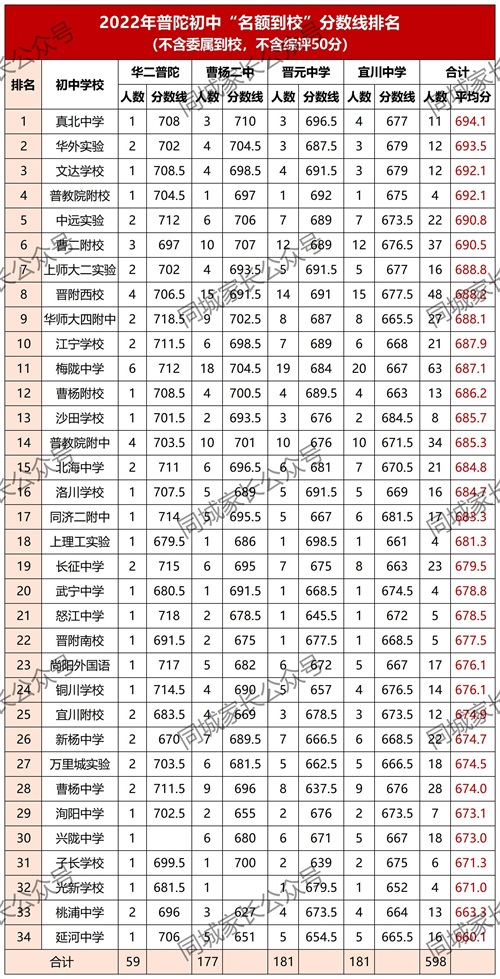 2022年,普陀区有34所不选择生源的公办初中,享受“名额分配到校”招生计划,合计到校名额611人。