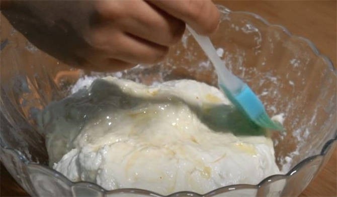1.准备350g普通面粉,3g盐增加面粉的筋性,230g左右的热水和面,烙的饼想要软,和面的时候就要和成偏软的面团,然后表面再涂抹一层油,增加面团的延展性,锁住水分,盖上保鲜膜至少饧面半个小时。